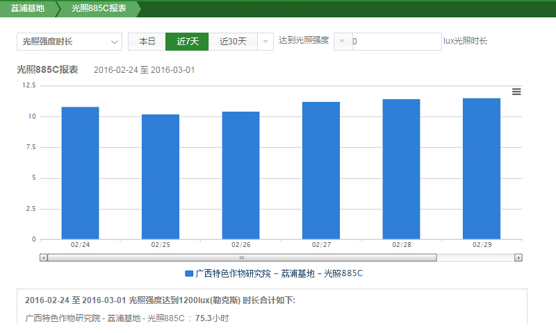 廣西特色作物研究院前身是創(chuàng)建于1965年的廣西柑桔研究所,對(duì)柑橘、砂糖橘等農(nóng)產(chǎn)品的品種培育、種植等具有先進(jìn)的科研水平。荔浦作為全國砂糖橘第一縣,其大面積推廣種植的背后離不開科學(xué)的作物研究。尤其是砂糖橘果樹生長發(fā)育、開花結(jié)果與溫度、日照、水分(濕度)、土壤以及風(fēng)、海拔、地形和坡向等環(huán)境條件緊密相關(guān),這些條件影響最大的數(shù)溫度,即使差異0.5℃的氣溫有時(shí)會(huì)出現(xiàn)截然不同的結(jié)果。因此,對(duì)一線數(shù)據(jù)如作物生長環(huán)境數(shù)據(jù)(光照、降雨量、土壤溫濕度、空氣溫濕度)、作物生長過程數(shù)據(jù)進(jìn)行采集、分析,是非常重要的工作。為了更好開展砂糖橘的科研工作,2015年始,廣西特色作物研究院借助天潤智力智慧農(nóng)業(yè)云平臺(tái)智能農(nóng)業(yè)監(jiān)控系統(tǒng),進(jìn)一步加強(qiáng)對(duì)作物基礎(chǔ)數(shù)據(jù)的采集分析,以使科研工作更科學(xué)精準(zhǔn)。