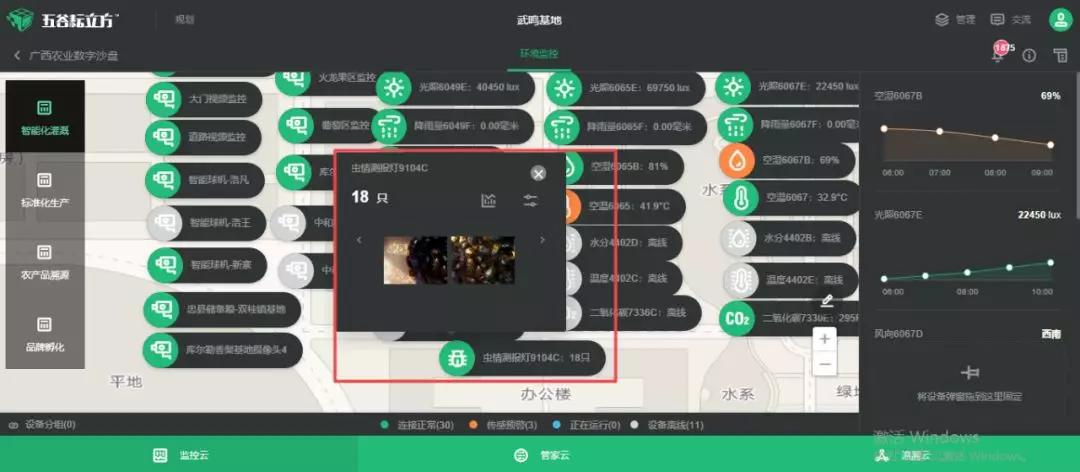 天潤智力在試驗站內(nèi)安裝了智能蟲情測報燈,在害蟲出沒高峰期進行誘蟲捕獲并拍照。通過系統(tǒng)遠程查看接蟲盒內(nèi)的蟲子情況,實現(xiàn)區(qū)域的病蟲害監(jiān)測和害蟲類別的自動分類和計數(shù),當系統(tǒng)監(jiān)測到接蟲盒內(nèi)的蟲子數(shù)量超過預(yù)設(shè)的數(shù)量時,系統(tǒng)會自動預(yù)警,提醒用戶此時為蟲害高發(fā)期,應(yīng)及時防治。