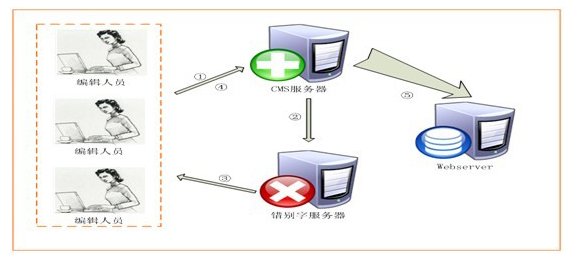 與CMS(內(nèi)容發(fā)布系統(tǒng))聯(lián)動(dòng)掃描模式網(wǎng)站錯(cuò)別字監(jiān)測(cè)平臺(tái)提供與CMS發(fā)布系統(tǒng)結(jié)合的WebService接口,國(guó)內(nèi)常見(jiàn)的CMS系統(tǒng)均可與G-ONE錯(cuò)別字系統(tǒng)實(shí)現(xiàn)良好的對(duì)接。網(wǎng)站編輯人員可在信息編輯完成后,先提交給錯(cuò)別字服務(wù)器審核,如檢測(cè)到錯(cuò)誤,則返回修改;如無(wú)錯(cuò)誤,則發(fā)布至web服務(wù)器。