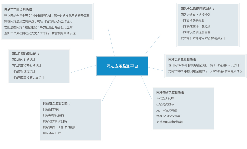 | 功能特點(diǎn) 網(wǎng)站無(wú)法訪問(wèn)、頁(yè)面突變、被掛木馬等異常第一時(shí)間自動(dòng)告警。 網(wǎng)站錯(cuò)別字、敏感詞檢測(cè),提升網(wǎng)站文字安全。-網(wǎng)站內(nèi)容維護(hù) 網(wǎng)站錯(cuò)誤圖片、錯(cuò)誤鏈接檢測(cè),提升網(wǎng)站質(zhì)量,增加網(wǎng)民滿意度。 網(wǎng)站過(guò)大圖片、過(guò)慢頁(yè)面檢測(cè),為網(wǎng)站性能優(yōu)化提供依據(jù)。 提高信息更新量,將網(wǎng)站群現(xiàn)有日更新量提高20%以上。 提升瀏覽點(diǎn)擊率,為各部門(mén)網(wǎng)站結(jié)構(gòu)設(shè)置提供依據(jù)。 |