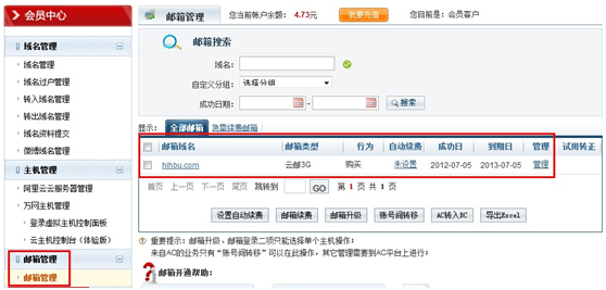付費完成后用戶可以在會員中心中的郵箱管理里查看到此郵箱產(chǎn)品。