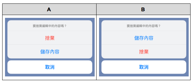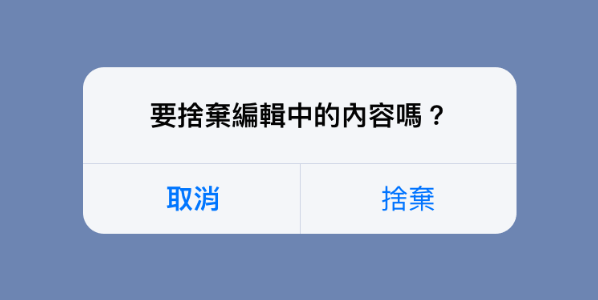 看過上面這些討論,我們可將這個警告框的說明文字中的「確定要取消編輯中的內(nèi)容嗎?」改寫成「要舍棄編輯中的內(nèi)容嗎?」