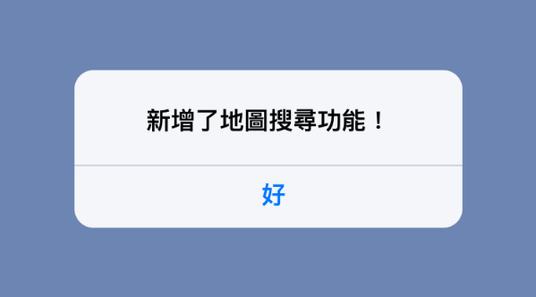 有的時候警告框只是用來傳達訊息,比如在說明新功能的時候,會用到只有一個按鈕的警告框。我們可想想在這種時候該如何設計按鈕的文字。一般來說,使用「OK(好)」雖然沒有問題,但在不同的語境中也有可能需要改成其他文字。