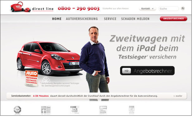 在多螢時(shí)代,網(wǎng)絡(luò)營(yíng)銷必須通盤考量各種平臺(tái)。因此,不論是pc版或移動(dòng)版網(wǎng)頁上的按鈕,都必須一樣醒目、好操作。英國(guó)保險(xiǎn)公司 Direct Line 的 iPad 網(wǎng)頁,就讓按鈕以平板裝置消費(fèi)者習(xí)慣的滑動(dòng)方式來運(yùn)作(如下圖)。