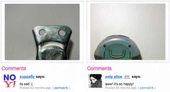 觀察下面的兩個(gè)簡(jiǎn)單物體。它們?cè)诒磉_(dá)情緒嗎?作為靜態(tài)的物體,它們表達(dá)的任何情緒都不會(huì)隨著時(shí)間的推移而改變。如果人格的主要維度是友好性和支配 性,你覺(jué)得哪個(gè)物體更友好?哪個(gè)更具有支配性?看看人們?cè)谡掌旅媪粝碌脑u(píng)論?鞓(lè)與友好的神態(tài)、愉悅和趨近行為相關(guān),而悲傷則與不友好、痛苦和回避行為 相關(guān)。