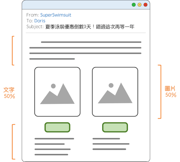 因此,在內(nèi)容上取得圖片與文字的平衡會(huì)是比較好的策略,電子郵件內(nèi)容適合的圖片與文字比例,大約是5:5 到6:4 左右,一方面可以保持圖片設(shè)計(jì)帶給讀者的豐富感受,透過圖像顯示縮短讀者閱讀信件所花的時(shí)間,另一方面當(dāng)在圖片無法正確顯示的情況下,讓讀者對(duì)于電子郵件內(nèi)容的理解達(dá)到最大。