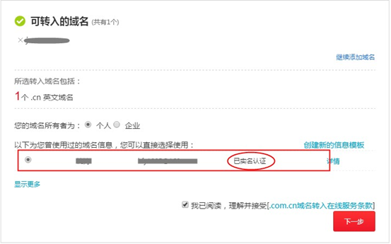 4、在進行域名轉(zhuǎn)入操作時,必須選擇一個“已實名認證”狀態(tài)的信息模板,才可提交 轉(zhuǎn)入并進行支付。