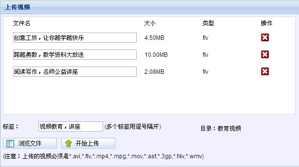 (1)在管理視頻界面中點擊“上傳視頻”,從彈出的對話框中點擊“瀏覽文件”,選擇本地的一個或多個視頻文件并點擊確定,選擇視頻分類,并為視頻填寫標(biāo)簽,如下圖;